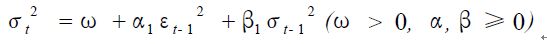 Bollerslev于1986年在ARCH ( p) 模型中增加了q个自回归项,推广成GARCH ( p, q) 模型.形式最简单的GARCH ( 1, 1)模型是实际中最常用的模型,只有一个滞后的非预期回报平方项和一个自回归项。