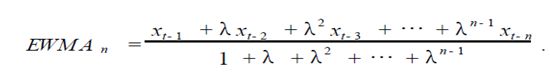 Ewma是指数移动平均的简称,主要是对时间序列中的数据依据时间先后赋予不同的权重,距离现在越近,赋予的权重越大,历史越远,赋予的权重越小;同时为了计算简便化,引入参数λ决定权重的分配,λ为衰减因子,取值范围在0~1之间。
