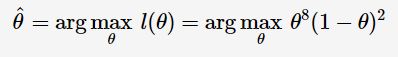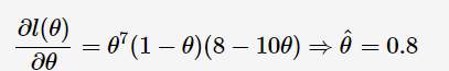 极大似然(Maximum Likelihood)估计为用于已知模型的参数估计的统计学方法。比如,我们想了解抛硬币是正面(head)的概率分布θ;那么可以通过最大似然估计方法求得。假如我们抛硬币10次,其中8次正面、2次反面;极大似然估计参数θ值: