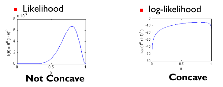 因为似然函数l(θ)不是凹函数(concave),求解极大值困难。一般地,使用与之具有相同单调性的log-likelihood,如图所示