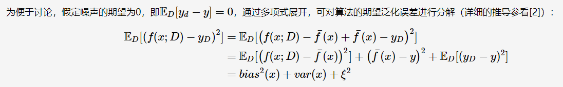 “偏差-方差分解”(bias variance decomposition)是用来解释机器学习算法的泛化能力的一种重要工具。对于同一个算法,在不同训练集上学得结果可能不同。对于训练集D={(x1,y1),(x2,y2),⋯,(xN,yN)},由于噪音,样本x的真实类别为yD(在训练集中的类别为y),则噪声为