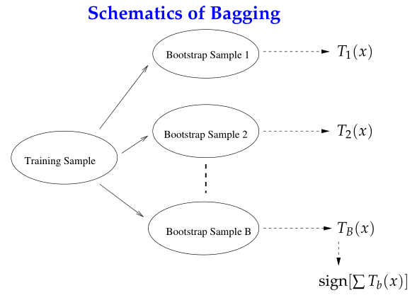 从上述问题的角度出发,集成学习分为两类流派:Bagging与Boosting。Bagging(Bootstrap Aggregating)对训练数据擦用自助采样(boostrap sampling),即有放回地采样数据;每一次的采样数据集训练出一个基分类器,经过MM次采样得到MM个基分类器,然后根据最大表决(majority vote)原则组合基分类器的分类结果。
