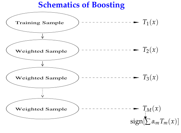 Boosting的思路则是采用重赋权(re-weighting)法迭代地训练基分类器,即对每一轮的训练数据样本赋予一个权重,并且每一轮样本的权值分布依赖上一轮的分类结果;基分类器之间采用序列式的线性加权方式进行组合。