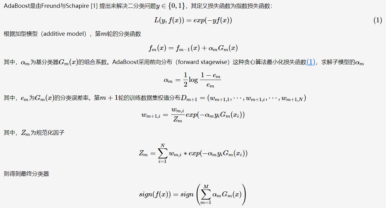 αm是em的单调递减函数,特别地,当em≤12时,αm≥0;当em>12时,即基分类器不满足弱可学习的条件(比随机猜测好),则应该停止迭代。具体算法流程如下: