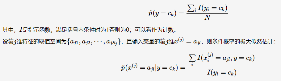 在朴素贝叶斯学习中,需要估计先验概率与条件概率,一般时采用极大似然估计。先验概率的极大似然估计: