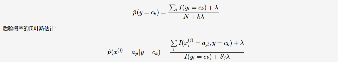 在估计先验概率与条件概率时,有可能出现为0的情况,则计算得到的后验概率亦为0,从而影响分类的效果。因此,需要在估计时做平滑,这种方法被称为贝叶斯估计(Bayesian estimation)。先验概率的贝叶斯估计: