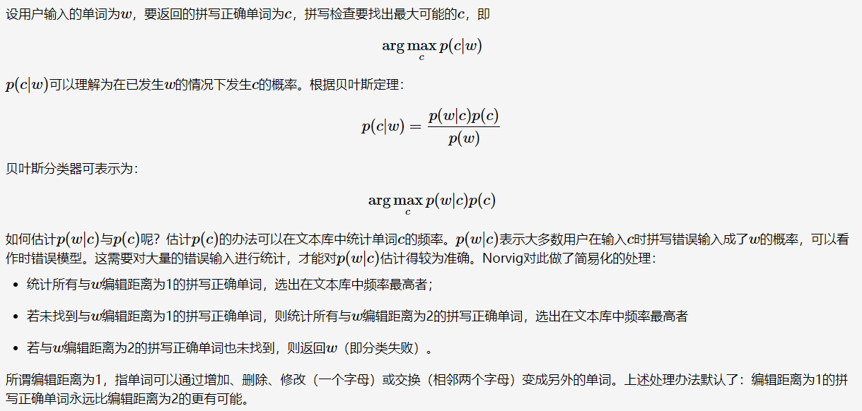 当用户在输入拼写错误单词时,如何返回他想输入的拼写正确单词。比如,用户输入单词thew,用户有到底是想输入the,还是想输入thaw?这种拼写检查的问题等同于分类问题:在许多可能拼写正确单词中,到底哪一个时最有可能的呢?大神Peter Norvig [2]采用朴素贝叶斯解决这个拼写问题。