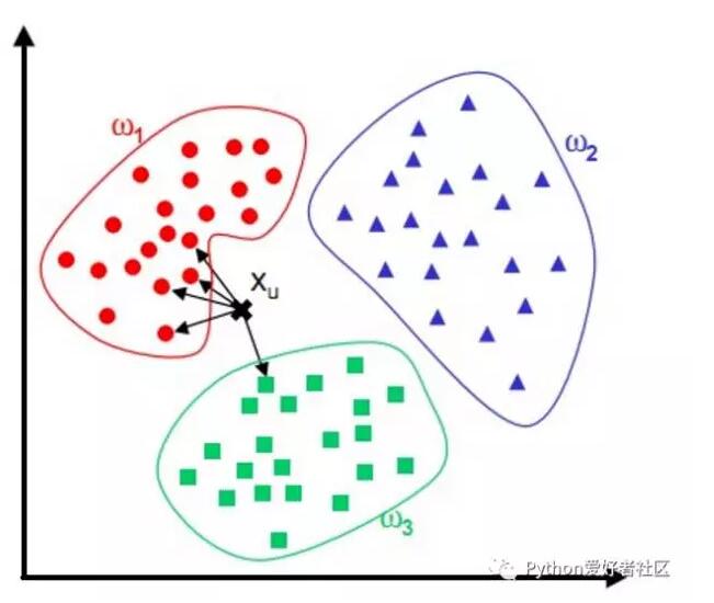 图示:这里我用一个常见到的图做介绍:1、有三类已知数据集(训练集),它们分别属于w1、w2、w3,这三类数据分别有自己的特征;2、有一个位置类别的数据(测试集)Xu;3、通过求Xu点到所有训练集数据的距离,取距离最近的n个点,查看这n个点所归属的类别,以少数服从多数的方式将Xu归类到已知训练集下