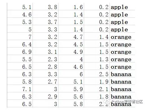 这里我构造了一个150*5的矩阵,分别代表三类数据。每行的前四个值代表数据的特征,第五个值代表数据的类别。如图: