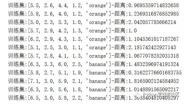 print('训练集:{}-距离:{}'.format(trainingSet[x], dist))