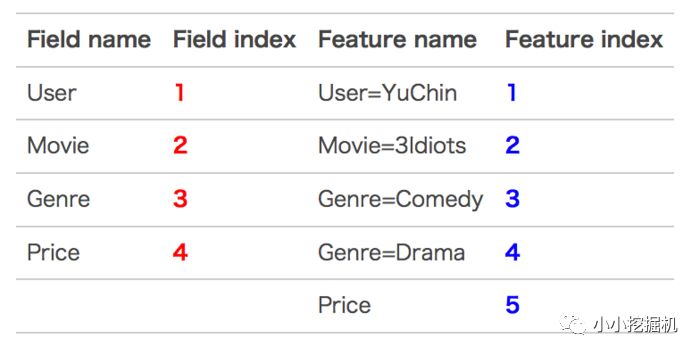这条记录可以编码成5个特征,其中“Genre=Comedy”和“Genre=Drama”属于同一个field,“Price”是数值型,不用One-Hot编码转换。为了方便说明FFM的样本格式,我们将所有的特征和对应的field映射成整数编号。