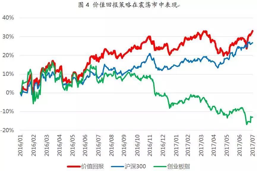 价值回报策略投资组合在震荡市背景下取得较好的收益。从上图中可以看出,在2016年1月至2017年7月的震荡市中,创业板指数下跌了12.93%,而价值回报策略却取得了33.19%的正收益,战胜创业板指数的同时也跑赢了同期沪深300指数26.88%的正收益。