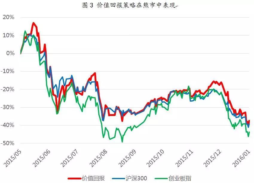 价值回报策略投资组合在熊市背景下依旧跑赢大盘。在2015年5月至2016年1月的熊市中,沪深300指数和创业板指数分别下跌了39.14%和43.72%,而价值回报策略投资组合仅下跌了37.38%,从上图中可以看出,价值回报投资组合远超创业板指数,在紧跟沪深300指数的同时取得了不错的超额收益。