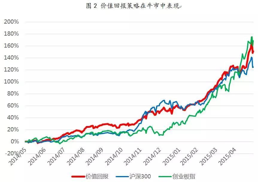价值回报策略投资组合在牛市背景下取得较好收益的同时不失稳健。从上图中可以看出,在2014年5月至2015年4月的牛市中,价值回报策略取得了151.07%的收益,高于同期沪深300指数124.48%的收益,虽然不及同期创业板指168.78%的收益,但从图中可以明显看出,价值投资策略的稳定性高于沪深300指数和创业板指数。