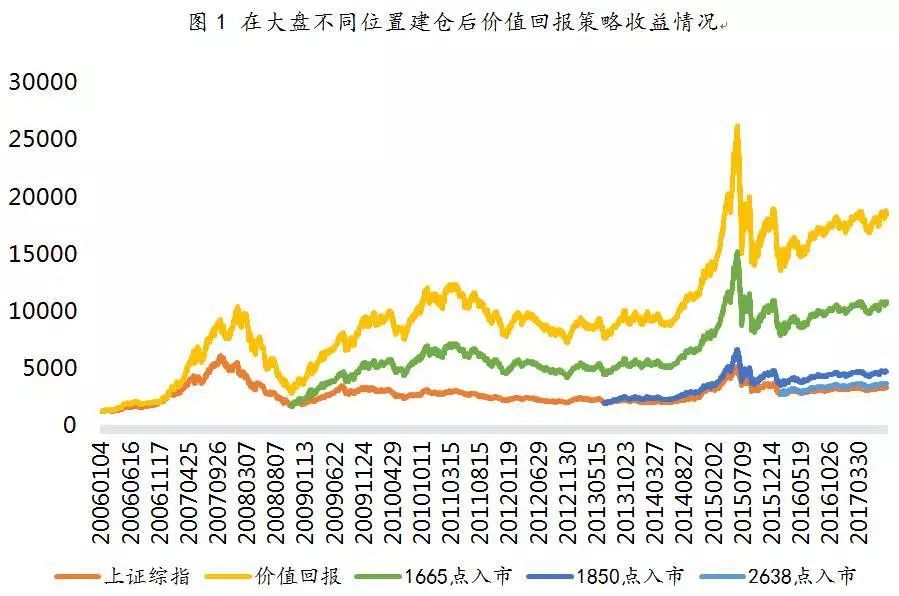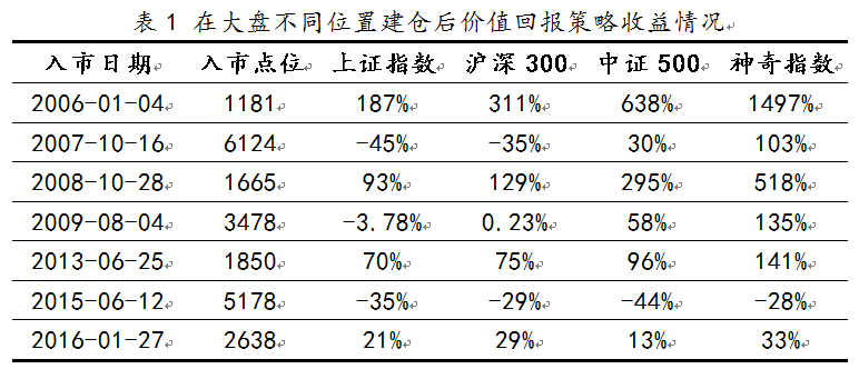 我们统计了在大盘不同的位置建仓以后,价值回报策略和大盘指数的收益情况。