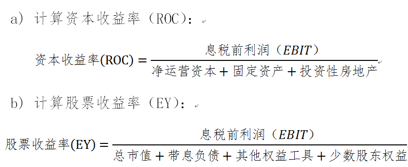 我们得到对于资本收益率(ROC)和股票收益率(EY)的计算公式如下:1.2策略构建