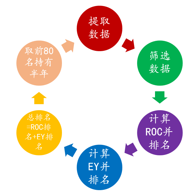 b)对每一只股票的资本收益率(ROC)排名和股票收益率(EY)排名求和,之后对和进行升序排列,得到最后的总排名;