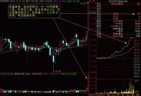 我们同样来举一个例子,2002年11月28日,在大势走软的情况下,用友软件放量涨停(图53),使软件科技板块全线上涨。从涨幅榜我们可以看出,涨幅居前的都是软件科技股(图54)。这种板块内的股票随即跟风上涨,没有层次,是典型的过江龙资金的短炒行为,难以持久。领头羊用友软件的即时走势为一分一分的缓慢上涨,有诱多之意。当日换手高达18%,表明抛压沉重,多头能量消耗过大,最后的封板量仅有248手,由此可以判定该股第二天不会有太好的表现。而领头羊一旦走软,这个热点即告结束。当日软件科技股已是全面启动,表明市场资金已全面分散,这个热点的炒作已进入末期,所以笔者明确指示会员,科技股第二日一旦走软应逢高出局,而不是逢低介入。