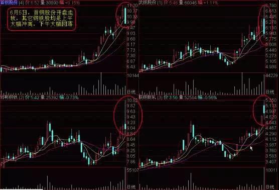 此时投资者应意识到,此热点已进入炒作末期。6月5日上午,钢铁板块全面启动,大批钢铁股涨停,连当时一向表现不佳的邯郸钢铁也涨停了,所有的外在的技术分析手段(K线、均线、技术指标等)均提示投资者应买进,而此热点的领头羊首钢股份当日开盘即跌,表明主流资金开始撤退。全面启动的结果是造成市场做多资金的全面分流,短线调整已不可避免,有经验的投资者开始大量抛售,下午几乎所有的钢铁股均大幅下跌,当日买进的投资者普遍被套10%以上。