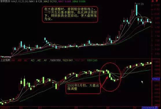 2000年5月初,大盘在科技股炒作告一段落的情况下,开始调整。而首钢股份逆势而上,短短一个月时间几乎翻倍。在此神话效应下,钢铁板块成为当时炒作热点。当时紧跟首钢启动的钢铁股没有几只,表明此热点处于主升阶段。2000年5月底6月初,首钢股份涨幅开始趋缓,这时市场出现了第二个神话股莱钢股份。