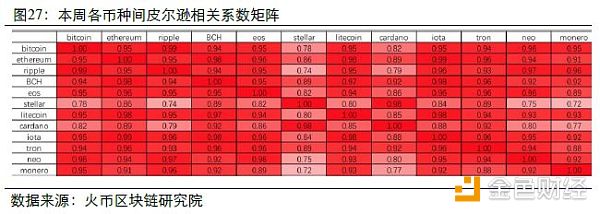 本周主流币种的走势相关性非常高,呈现同涨行情:除了Stellar和Cardano之外,其余主流币两两之间的相关系数均在0.85以上,Stellar和Cardano与其余主流币之间的相关系数也都在0.72以上,呈强相关。