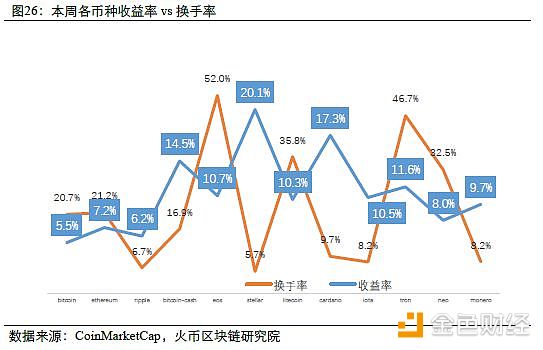 本周主流币种中换手率排名前三的依次为EOS(本周52%,上周84.3%)、TRON(本周46.7%,上周41.4%)和LTC(本周35.8%,上周44%);换手率最低的三个币种为Stellar(本周5.7%,上周7.8%)、Ripple(本周6.7%,上周10.8%)、IOTA(本周8.2%, 上周14.9%)。大多数字货币本周换手率有所下降,换手率下降最为明显的EOS,下降32.5个百分点。