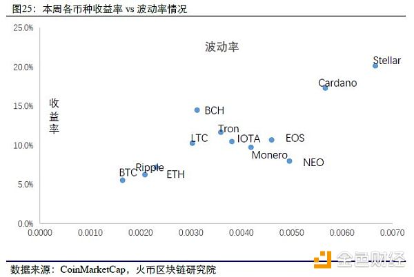 本周相关系数最低的是Stellar和Monero,相关系数0.72,其次为Stellar与Ripple,相关系数0.74;相关性最高的为BTC与Ripple以及ETH与IOTA,相关系数均为0.99。