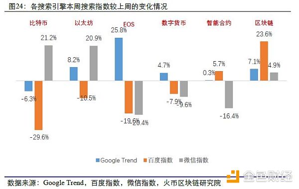本周百度搜索上比特币/以太坊/EOS/数字货币的搜索量较上周均有所下降,但数字货币和智能合约的搜索量却有所上升;Google Trend本周与EOS的搜索量比上周大幅上升,其余变化不大;微信指数比特币和以太坊的热度较上周有上升。从话题来看,区块链的搜索量在三大引擎的搜索量均有所上升。