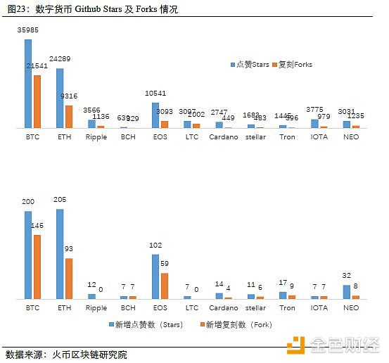 在Github社区中,历史活跃度最高的三个币种为BTC、ETH和EOS。在本周的新增点赞数(Stars)和复刻数(Forks)中,排名前三的仍然为BTC,ETH和EOS。