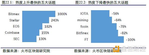 在三个领域所有话题中, “Bitmex”、“Stellar”、“EOS”、“Coinbase”和“SEC”的关注度上升最快,“FT”、“Bitfinex”、 “fcoin”、“ Mining”和“IOTA”的关注度下降最快。