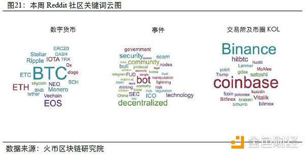 同样,火币研究院基于国外最大的论坛Reddit中“虚拟货币(Crypto Currency)”类的发帖和回复统计了“数字货币”、“事件”和“交易所及KOL”三大类关键词。