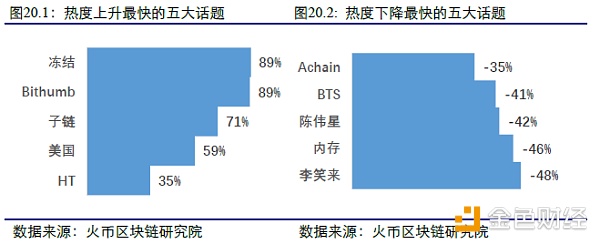 在三个领域所有话题中, “冻结”、“Bithumb”、“子链”、“美国”、“HT”的关注度上升最快,“李笑来”、“内存”、“陈伟星”、“BTS”、 “Achain”的关注度下降最快。