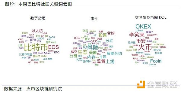 火币区块链研究院通过自然语言识别(NLP)进行断词,从国内最大的区块链论坛巴比特的帖子和回复中统计了“数字货币”、“事件”和“交易所及KOL”三大类关键词。
