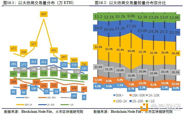 以太坊本周无论大额转账还是小额转账的交易量均有所下降。从比例上来看:10K以上的ETH交易量占总交易量的10.5%比上周下降0.8个百分点,10K以下的ETH交易量占总交易量的89.5%比上周上升0.8个百分点。