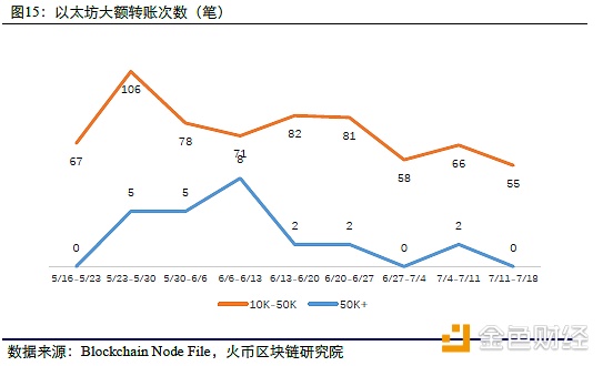 火币研究院基于转账金额对以太坊交易进行了分类:金额>5万ETH的为超大额转账,金额介于1万-5万ETH的为大额转账,金额1万以下的为其他。本周以太坊有无超大额转账,大额转账笔数较上周的66笔下降至55笔。