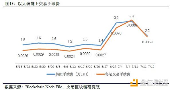 本周以太坊转账手续费较上周有所下降,但仍处于高位状态,从3.3万ETH下降至2.2万ETH。平均每笔交易的手续费为0.0053ETH,与上周相比下降38%。