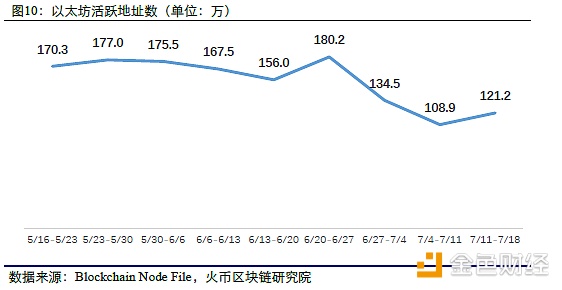 本周以太坊活跃地址数有所增加,从上周108.9万上升至121.2万,上升11.3%,继前两周大幅的下降后有所反弹。