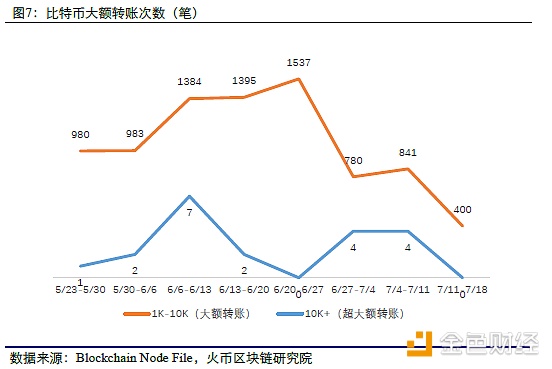 火币研究院基于转账金额对比特币交易进行了分类:金额>1万比特币的为超大额转账,金额介于1千-1万比特币的为大额转账,金额1千以下的为其他。本周比特币无超大额转账,大额转账笔数从上周的841笔下降至400笔,为近两个月内最低。