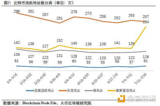 本周新建地址数、连续活跃地址数与上周总体变化不大;重新激活地址数骤增,直接导致活跃地址数巨幅增加。其中持续活跃地址数较上周57万上升至61万个,占总活跃地址数的14.4%(上周为17.9%);新增地址数为126万个,比上周上升4万;重新激活地址数为234万,比上周上升95万,增幅68.3%。