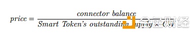 虽然Bancor Network近期也经历被盗风波,但这不妨碍我们继续研究这一算法。既然是原本要用于国际贸易的模型,那必然涉及到不同实体间如何兑换。Bancor 白皮书中对定价模型有着十分严谨和详细的说明。它定义了两类token:一种是通常会流通使用的 connector token(即储备金,例如:BTC、ETH、EOS等),而另一种是作为“超平台”中间媒介的 Smart Token。为了使得兑换价格满足刚才提到的供需关系,设计的公式中的价格为 connector 的可流通余量(balance)除以 按照一定系数的Smart Token 供应量: