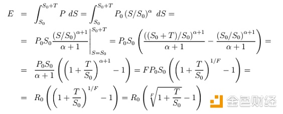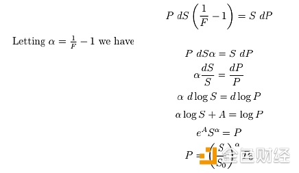 定义R为当前connector的余量、S为当前Smart Token的供应量、F为系数(即上文中的CW)、P为当前Smart Token的价格,那么有: