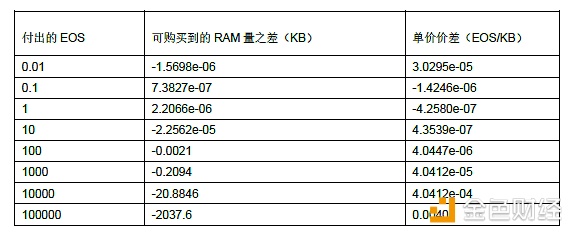 当要付出不同量 EOS 时,分别计算出F=0.0005和F=0.5的 RAM 价格结果,可购买到的RAM之差(F=0.0005-F=0.5)以及两个价格之间的差值: