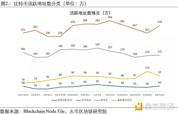 本周持续活跃地址数为60万个,与上周的56万个相比稳定中稍有提升;从比例上看,本周持续活跃地址数占整体活跃地址数的18.3%,比上周的16.5%稍有提升。本周新增地址数为171万个,与上周几乎持平。重新激活地址为97万,较上周的113万有明显下降,下降比例为14.2%,但是相较两周前还是有比较明显的提升,说明近期有较多的失活地址开始重新激活。