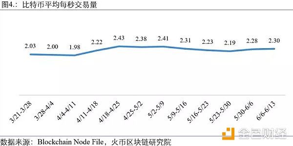 本周比特币平均每秒交易量为2.30笔,相对上周的2.28笔略有上升。