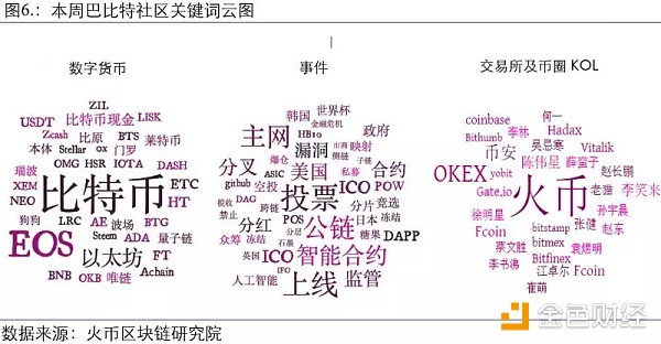 火币区块链研究院通过自然语言识别(NLP)进行断词,从国内最大的区块链论坛巴比特的帖子和回复中统计了“数字货币”、“事件”和“交易所及KOL”三大类关键词。
