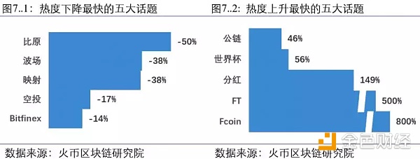 三个领域中“热点事件”的社区关注情况较上周变化较大。在众多话题中, “Fcoin”、“FT”(Fcoin平台的代币)、“分红”、“世界杯”和“公链”的关注度上升最快,“比原”、“波场”、“映射”、“空投”和“Bitfinex”的关注度下降最快。