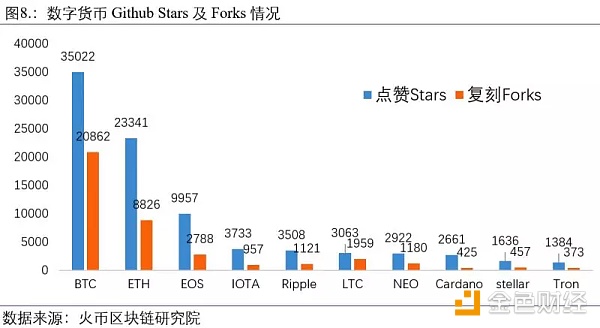 在Github社区中,代码活跃度最高的三个币种为BTC、ETC和EOS,“点赞”(Star)数依次为35022、23341和9957次;“复刻”(Fork)次数依次为20862、8826和2788。