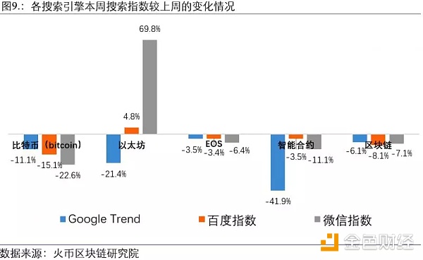 本周绝大多数区块链相关的google、百度和微信搜索量较上周都有所下降,唯独以太坊在微信上的搜索量较上周有明显上升。