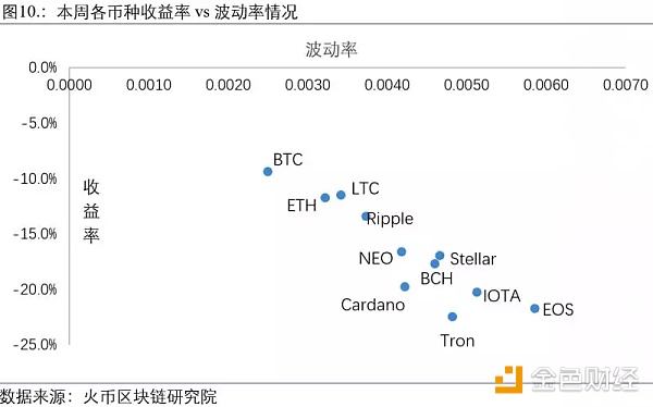 本周市场整体下挫,价格跌幅最大的为TRON,下跌22%;价格跌幅最小的为BTC,下跌9%。同时,EOS价格波动率(价格标准差)最大,为0.0061;BTC价格波动率最小,为0.0024。