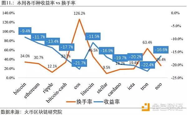 本周主流币种中换手率排名前三的依次为EOS(126%)、TRON(63%)、Litecoin(46.5%);换手率最低的三个币种为Stellar(9.5%)、Ripple(12.1%)和Cardano(18.2%)。